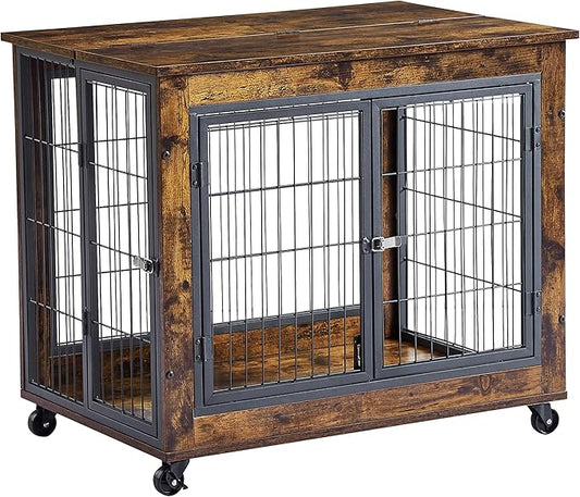 Furniture Style Dog Crate Side Table on Wheels,Decorative Pet House Heavy Duty Kennel with Double Doors and Lift Top,for Small and Medium Dogs,31.50'' W x 22.05'' D x 25'' H,Rustic Brown