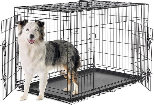 Sweetcrispy Dog Crate with Divider Panel, 42 Inch Double Door Folding Metal Wire Dog Cage with Plastic Leak-Proof Pan Tray, Large XL Pet Kennel for Indoor, Outdoor, Travel