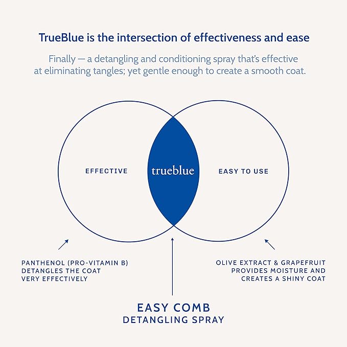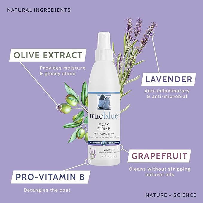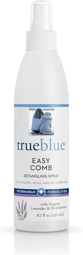 - PREMIUM GROOMING SOLUTION: Whether you groom puppies and dogs professionally or in your own home, you’ll want to pamper each poop with this TrueBlue Lavender & Olive Extract Easy Comb Dog Hair Detangling Spray developed by veterinarians and expert botanists.