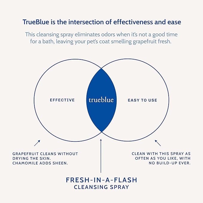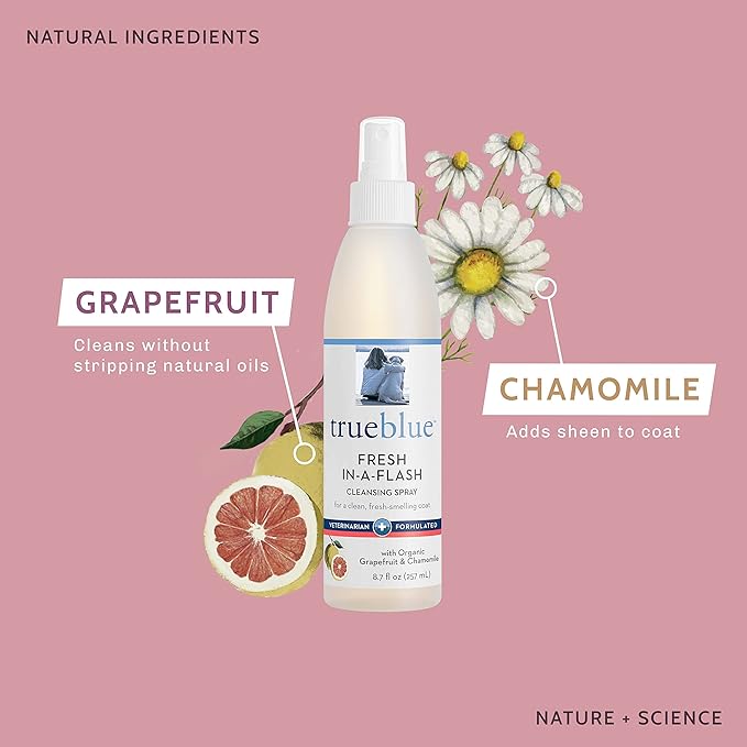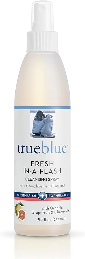 - PREMIUM GROOMING SOLUTION: Whether you groom puppies and dogs professionally or in your own home, you’ll want to pamper each poop with this TrueBlue Grapefruit & Chamomile Fresh-in-a-Flash Cleansing Dog Spray developed by veterinarians and expert botanists.
