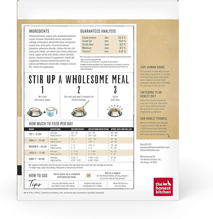 - CAGE FREE TURKEY & ORGANIC WHOLE GRAINS: The Honest Kitchen Whole Grain Turkey dog food is made with real whole food ingredients like cage free turkey, organic oats & apples, which are gently dehydrated for maximum nutrient retention & digestion.