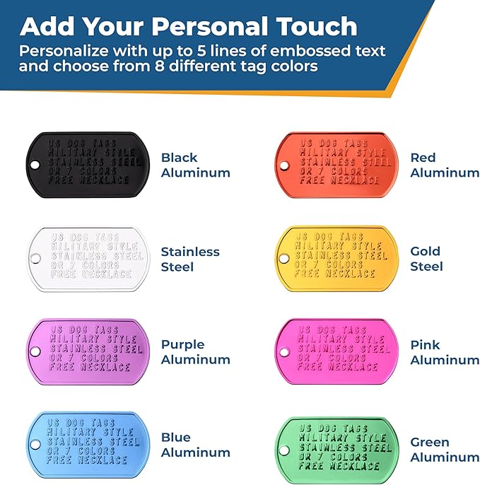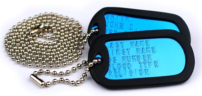 - Genuine personalized military ID tag set comes with 2 tags, chains, & silencers. Includes personalization of up to 5 lines of text on each tag (each tag can be identical or have different info)