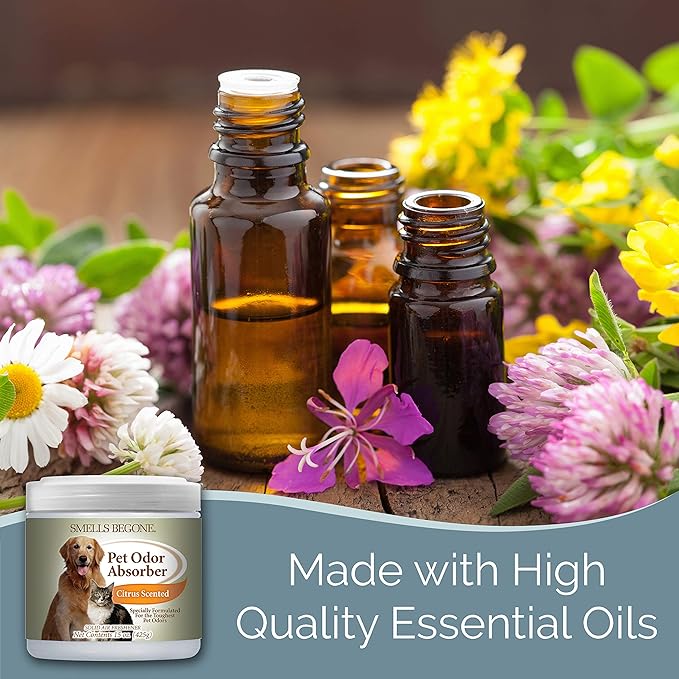 - MADE WITH ESSENTIAL OILS - Each Pet Odor Absorber contains 15 Ounces of product. The products are made with plant derived ingredients and formulated with a blend of essential oil based fragrances which adds a distinct and unforgettable aroma to any area you place and use the jar.
