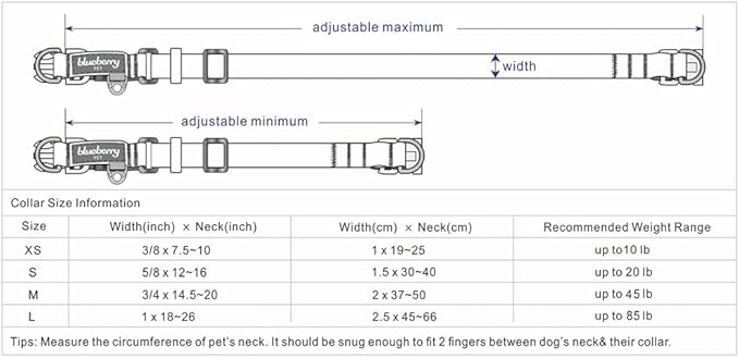 - Neck 18"-26", Width 1", Size Large; The dog collar reflective does not stretch itself, please make sure leave ONLY 2 fingers between collar and dog neck. A properly fitting nylon dog collar and harness won't leave any room for your dog to chew