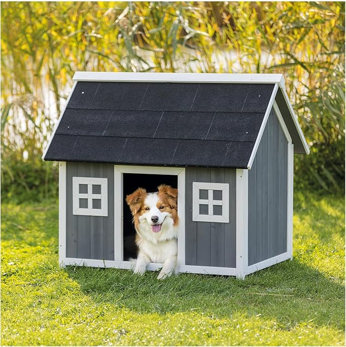 - DURABLE: The outdoor dog house consists of a strong & sturdy pine construction. Heavy-duty mineral roofing felt and a weatherproof sealer provide ultimate protection for long-term outdoor use