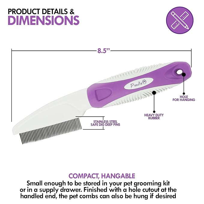- Slip-proof, Easy Grip: Highlighted by its ergonomic shape & ridged texture, the contoured plastic handle of the Poodle Pet Dog Pet Comb is easy to grip.