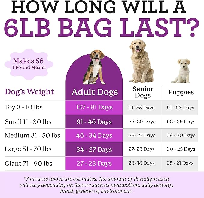 - Paradigm’s 6 pound bag conveniently makes 56, one pound finished meals for your canine companion, quantity of meals depend on the weight of your dog