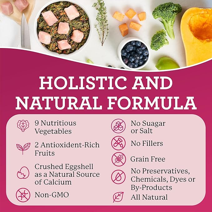 - Made with 9 dehydrated vegetables, 2 antioxidant rich fruits, 2 energy packed seeds, bone meal and crushed eggshells for calcium, and 9 other immune boosting superfoods