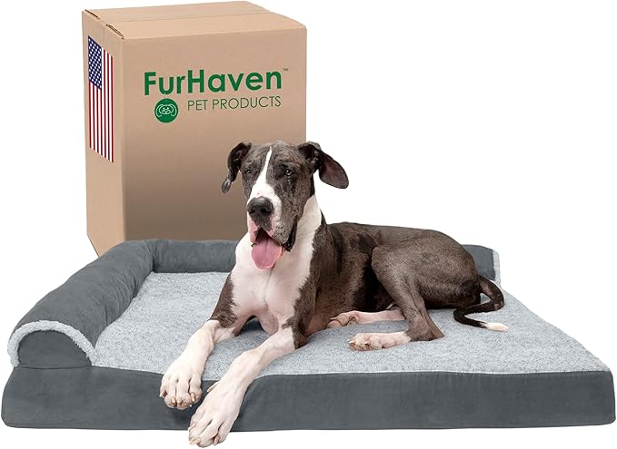 Furhaven Orthopedic Dog Bed for Large Dogs w/ Removable Bolsters & Washable Cover, For Dogs Up to 125 lbs - Two-Tone Plush Faux Fur & Suede L Shaped Chaise - Stone Gray, Jumbo Plus/XXL