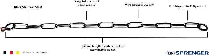 - Black Stainless Steel Long Link Fur Saver Collar: Wire Gauge 3mm thick by 21 inches (53cm) overall length for dogs with the neck size up to 18 inches; This collar works best for dogs up to 110 lbs (50kg)