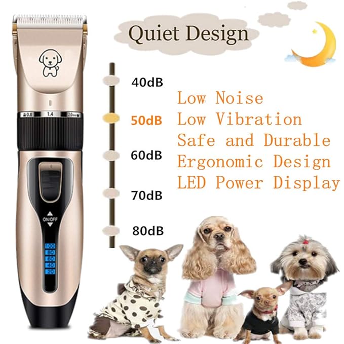 - 【Low Vibration & Low Noise】 Pet hair trimmers for dogs with Precision motor, low vibration and ultra quiet design, free it from work noise with only about 60 db, to help the pet feel at ease, not afraid haircut any more. Powerful motor of professional Electric Pets Hair Trimmers not to clamp and hurt pet hair.