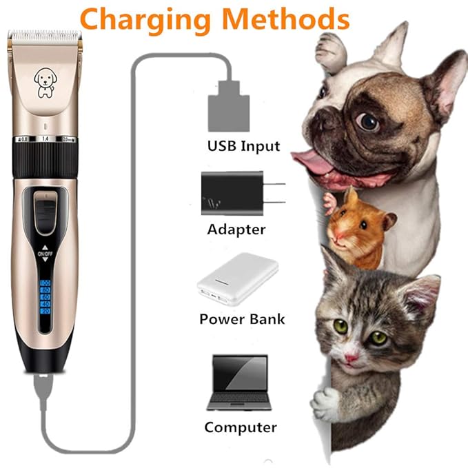 - 【LED Display & Working time】 Battery capacity and status of charging is displayed in percent, avoid power interruption during usage. Charging for five hours, pet grooming clippers can sustain uses of 70 minutes.