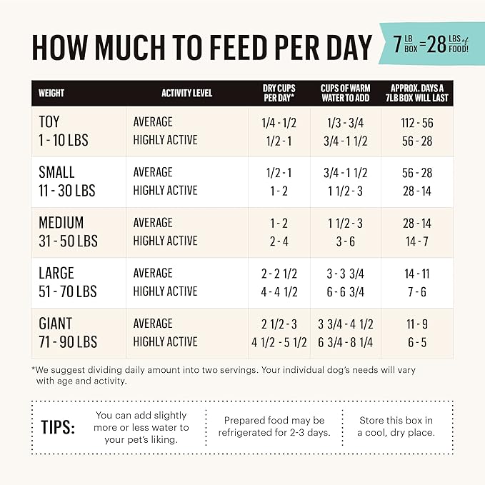 - MAKES 28 LBS OF FOOD: Just add warm water for a wholesome & delicious meal that rehydrates to 4x its weight. A 7 LB box makes 28 LBs of fresh food! Serve alone as a complete easy homemade meal, or use as a topper to dry food.