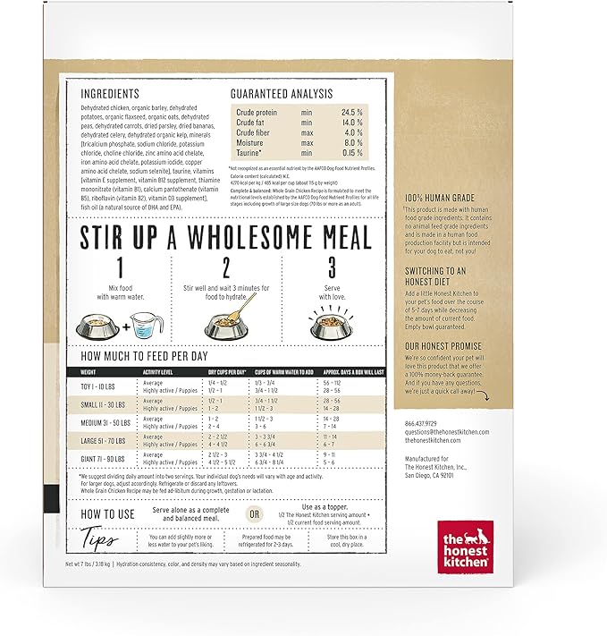 - RANCH RAISED BEEF & ORGANIC WHOLE GRAINS: The Honest Kitchen Whole Grain Beef dog food is made with real whole food ingredients like ranch raised beef, organic oats, carrots & apples, which are gently dehydrated for maximum flavor & nutrient retention and easy digestion.