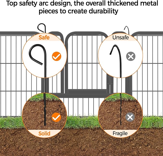 - Solid Metal Stakes Ensuring Safety: The upgraded solid metal stakes achieve a fully enclosed bend, avoiding sharp edges to protect pets. At the same time, the solid stakes are easily inserted into the ground to keep the walls more stable and rigid when the dogs exercise