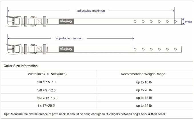 - Neck 9"-12.5", Width 5/8"; The collar does not stretch itself, please make sure leave ONLY 2 fingers between collar and dog neck. A properly fitting collar and harness won't leave any room for your dog to chew