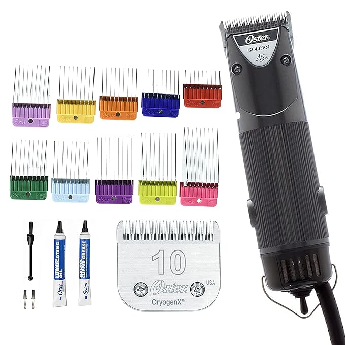 Oster Golden A5 Animal Pet 2-Speed Hair Clipper with Detachable CryogenX Size 10 Blade 10-Piece Stainless Steel Pet Clipper Guide Comb Kit (078936-100-000)
