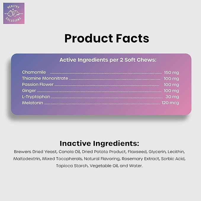 - 🗸 VETERINARIAN FORMULATED -- with Melatonin, Chamomile, Passion Flower, Thiamine, L-Tryptophan, and Ginger to help soothe sensitive stomaches.