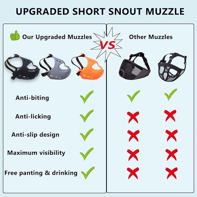 - Soft & Strong: Soft rubber material enhanced durability makes the english bulldog muzzle strong but soft. The short snout dog muzzle gives all-around mouth protection and does not bruise the dog's mouth or hurt the skin. Your dog will feel comfortable and won't panic