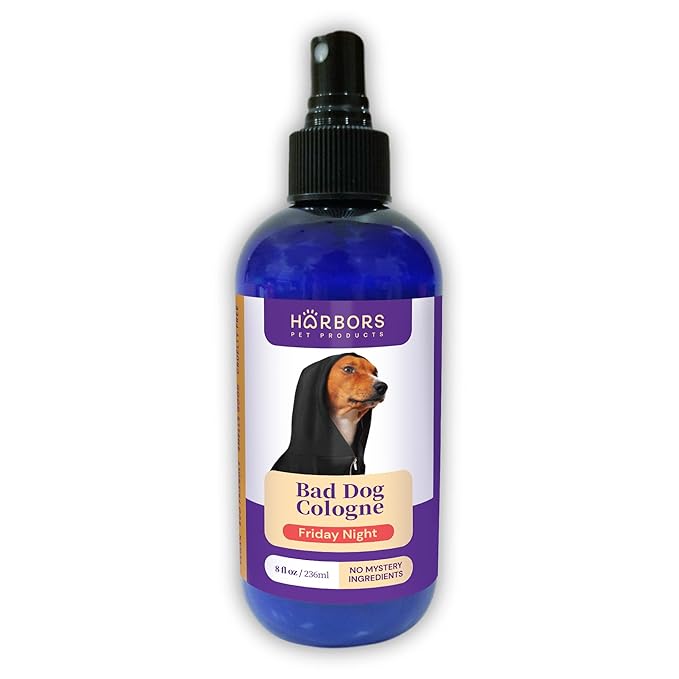 - BAD DOG COLOGNE (FRIDAY NIGHT) - Just because your dog is tough does not mean they should not smell good. The scent is calming and upscale. This scent begins with top notes of mahogany and crystal amber, followed by middle notes of star jasmine, clove leaf, and soft cashmere. Sitting on base notes of tonka bean, and white musk. Anyone you meet will be left with two thoughts…that is one tough looking dog and that dog smells @#$%&! GREAT.