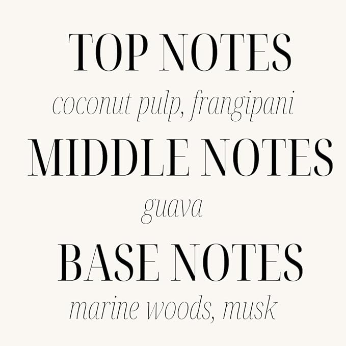 - Top notes: coconut pulp and frangipani, Middle notes: guava, Base notes: musk