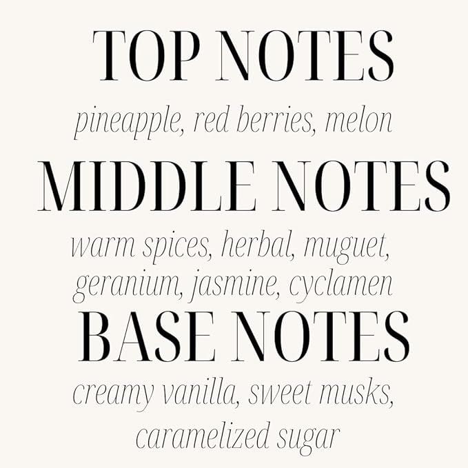 - Top notes: pineapple, red berries and melon, Middle notes: warm spices, herbal, geranium, jasmine and cyclamen, Base notes: creamy vanilla, sweet musks and caramelized sugars