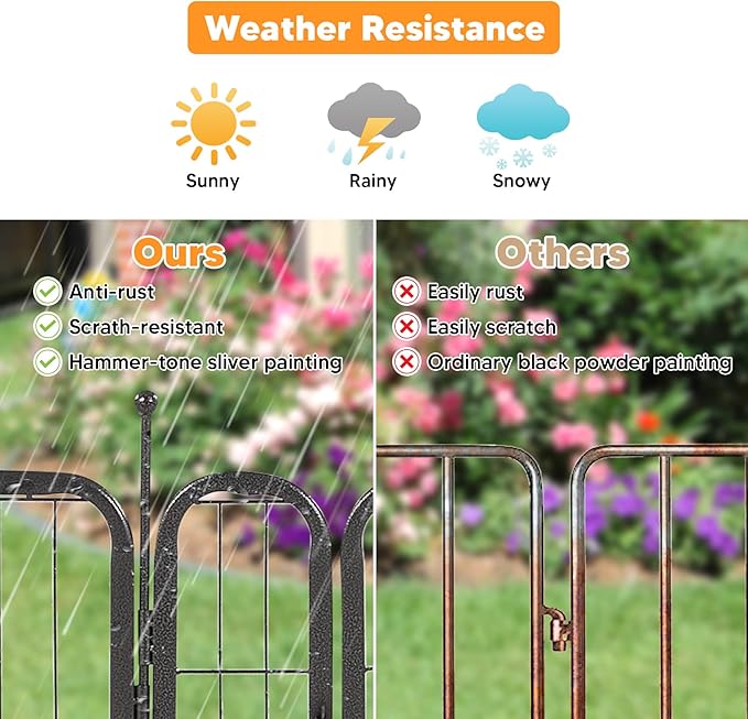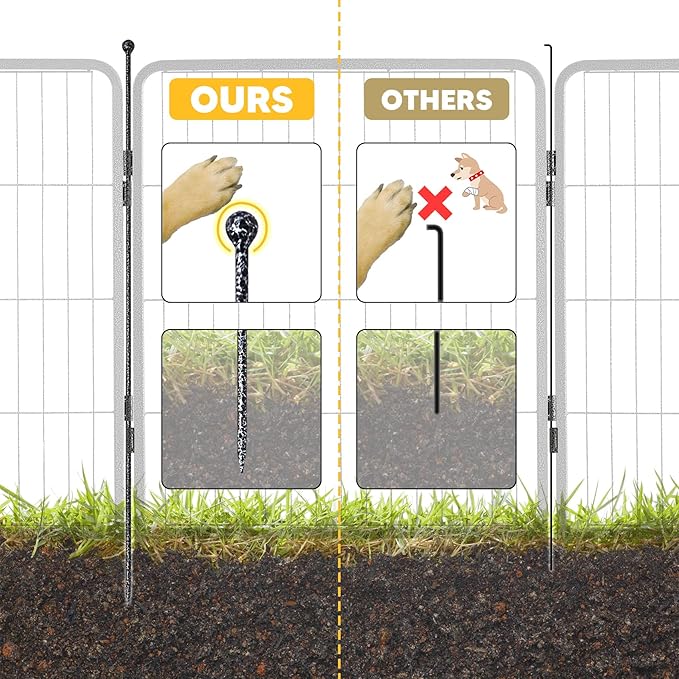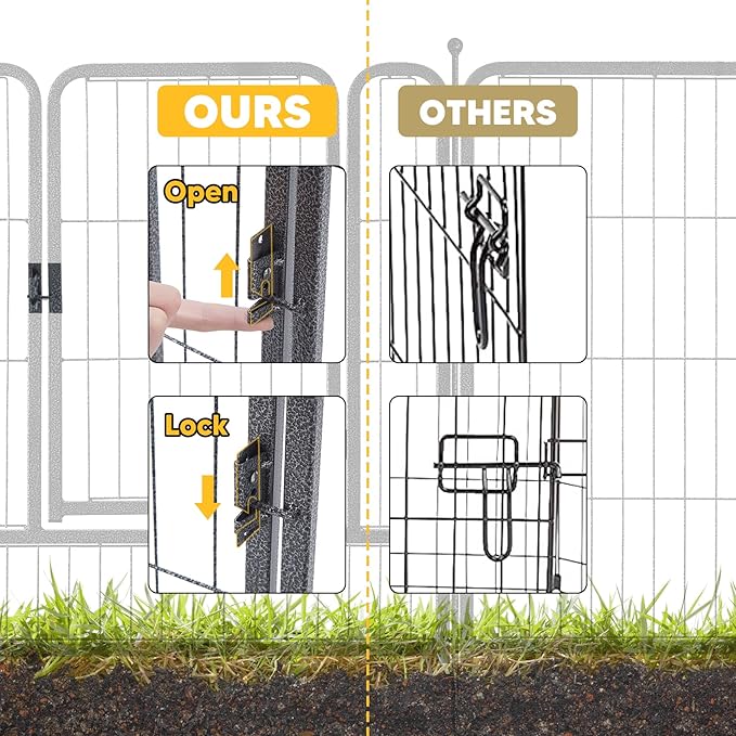 - 🐶Upgraded Pet Playpen: Adopts double new type door lock design, much safer and more convenient. Made of heavy duty metal panels and stakes with thick powder coating, non-toxic, anti-rust, and waterproof. Ensures long time use no matter indoor or outdoor. Smooth surface without burrs, the stakes are more easily inserted into the ground for more stability and rigidity.