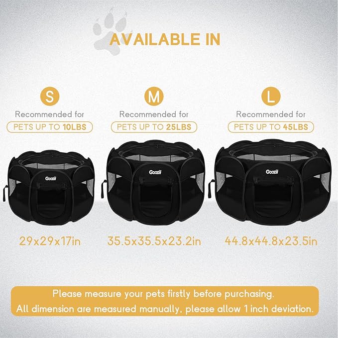 - 【Spacious & Comfort】: This dog playpen keeps your pet stay in this pet playpen secure, spacious interior give more fun for your pet. Size is 29*29*17 inches, great for small animals up to 10 LB. There are 1 inch error range because of technical issue. The portable cat playpen is also a ideal present for cat lovers as Christmas gifts.