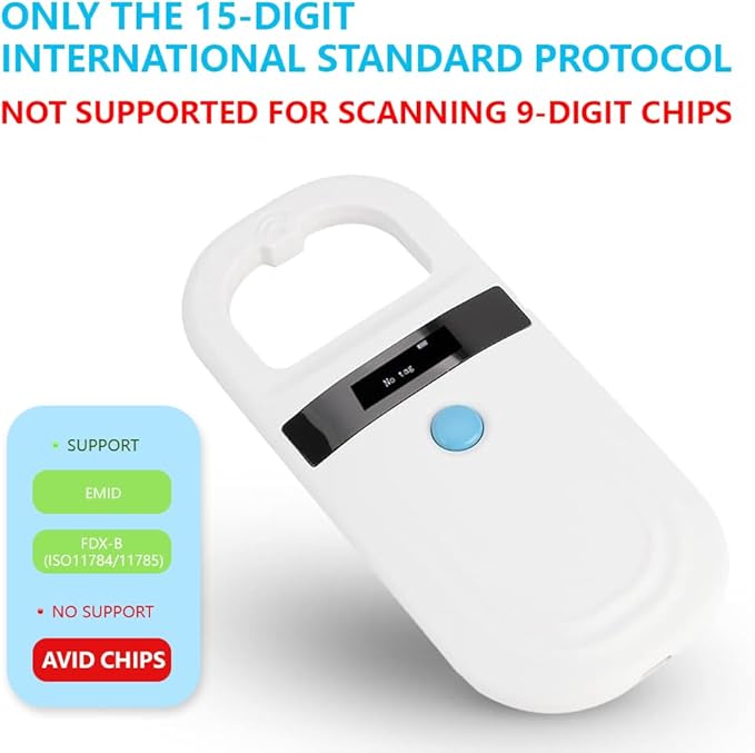 - 【Microchip Reader】Please attention that the reader CAN NOT read Avid chips. The 9-digit ID cannot be recognized. Only the 15-digit international standard protocol can be recognized. The microchip for dogs adopts wireless identification technology, supports reading FDX-B (ISO11784/11785) and EMID microchips.