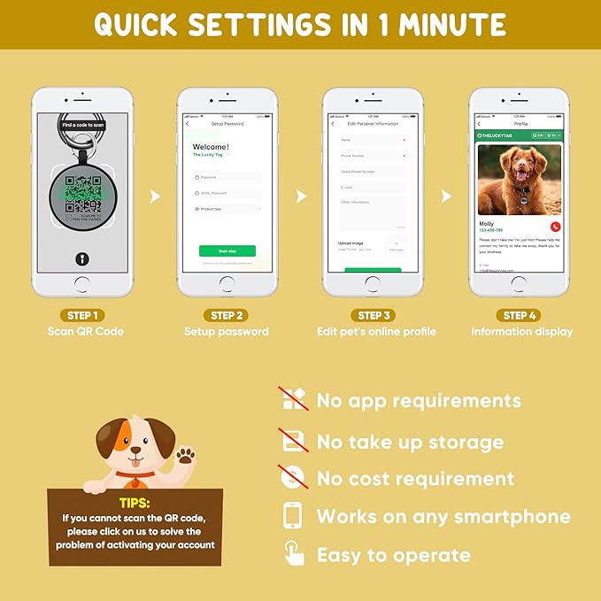- 【HOW TO SET UP QR CODE INFORMATION】Scan the QR code to enter the web page, then set the password to activate the account, and start editing personal information. Please enter your phone number and email in the required fields. Then click "Activate". Start enjoying your most funny pet tag. Anyone who finds your pet can access your pet profile and contact you to return your pet. No APP required!