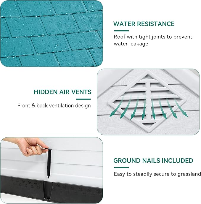 - WEATHERPROOF STRUCTURE- Sealed protective design, 2.8 in high base along with slanted roof harmonize to resist dirt, rain, snow, and other weather elements; Our outdoor dog house also has 2 ground nails to ensure stability during heavy winds.