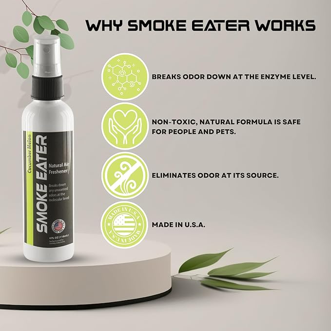Smoke Eater All Purpose Odor Eliminator - Breaks Down Foul Scents at the Molecular Level - Smoke, Food, Pet and Stale Odor - Ideal For The Home, Apartment Cars, Boats - 4 oz Travel Bottle (Cucumber