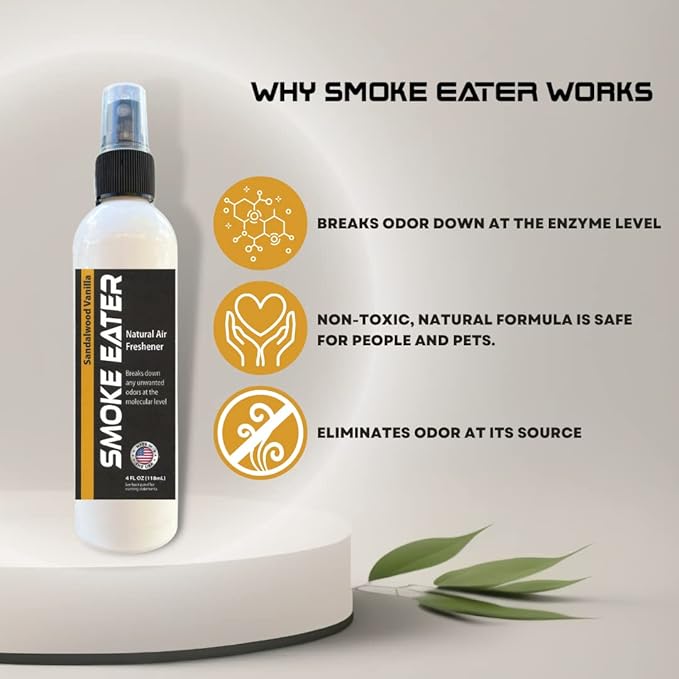 - BREAKS DOWN ALL ODOR AT THE MOLECULAR LEVEL - This is not a “mask” to hide the odor, it actually eliminates odors at the source by breaking the enzymes down and leaving the surface smelling clean. The scent of Smoke eater even disappears after about 15 mins, leaving the room smelling like you never sprayed a thing