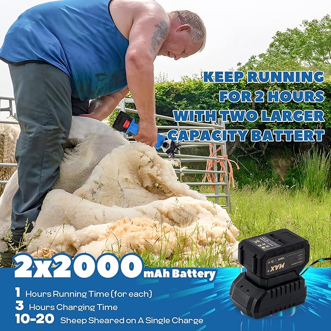 - TWO HOURS OF BATTERY LIFE - Equipped with two 2000mAh lithium batteries, no plug or power cord required. Each battery provides you with 1 hour of battery life when fully loaded, allowing you to work more freely. And as a professional shearing tool set that can meet the needs of farms, the LuzRise cordless wool shears can shear 5-10 sheep an hour and can trim long wool for goats, sheep, alpacas camels, alpacas, large dogs, angora rabbits and other animals.