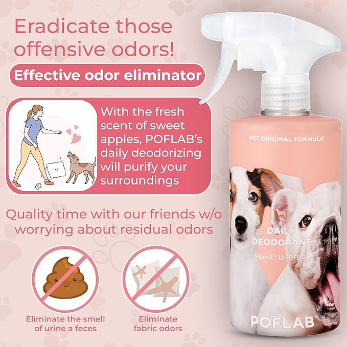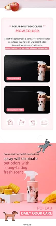 - Delightful scent: Our pet deodorizer spray has a refreshing scent that combines a crisp apple base with a subtle floral fragrance. This delightful aroma will keep your furry friend smelling clean and fresh for hours on end without overwhelming their sensitive nose.