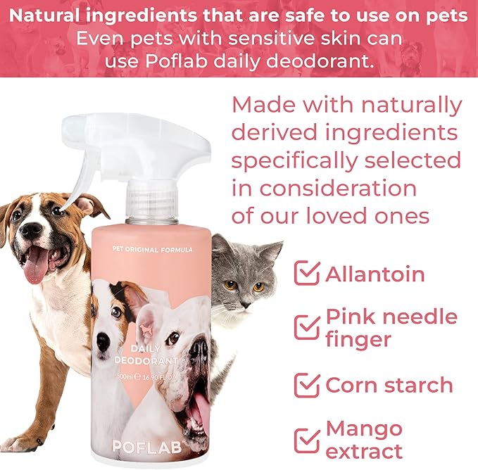 - Natural ingredients: Our pet deodorizer is made with a blend of natural ingredients that are not only effective at neutralizing odors but also gentle on your furry friend's skin. Our unique formula includes Allantoin, Pink Needle Flower Extract, Cornstarch and Mango Extract. These ingredients work together to eliminate odor-causing microbes and keep your pet feeling fresh and clean