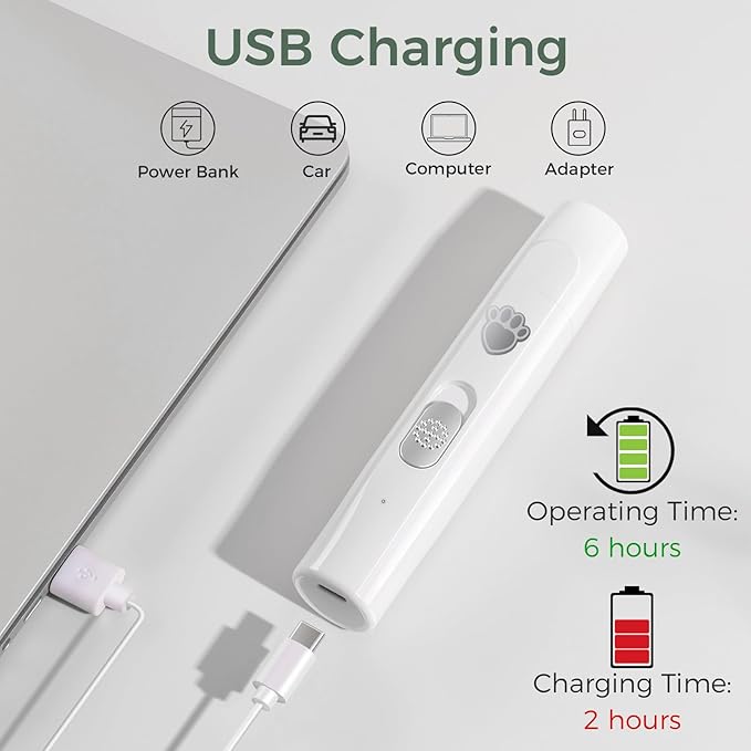 - Rechargeable & Portable: The Cordless Dog Grinder is rechargeable, includes a USB cable that allows you to easily connect to a laptop, AC adapter, or charging bank for charging. The lightweight and ergonomic body design also makes it easier to operate, allowing you to use this electric dog nail grinder anywhere