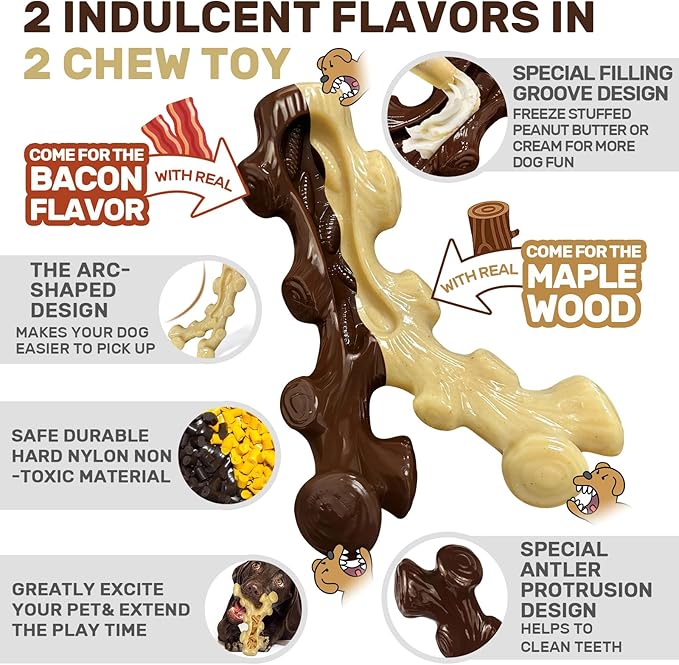 - Truly tempting taste-this dog toy has a unique smoking process,infused with 100% authentic taste;brown toys exude the aroma of crispy bacon,while beige toys have an elegant woody scent. Trust us,these enticing scents will tempt your dog to chew.Charming and chewy,your furry companion will never be able to resist.Not only does it reduce anxiety and prevent destructive chewing,but it also teaches your precious dog healthy chewing habits-perfect for training,teething,weight control and much more