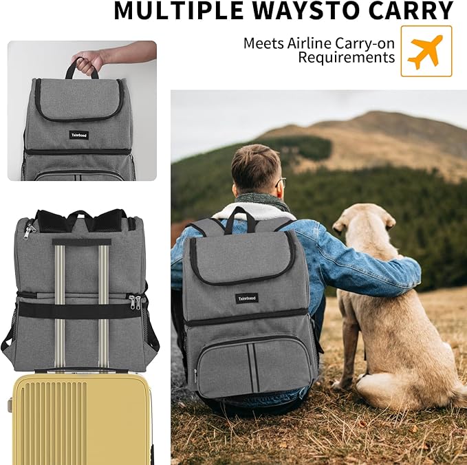 - Our travel dog bag has two main compartments and an internal pocket mesh for easy access to different items; There are multifunctional pockets on the front and side of the bag for quick access to water, garbage bags, mats, etc.Three convenient carrying methods: portable, shoulder backed, and on the suitcase, suitable for dogs' weekend bags, dog camping trips, and hiking trips