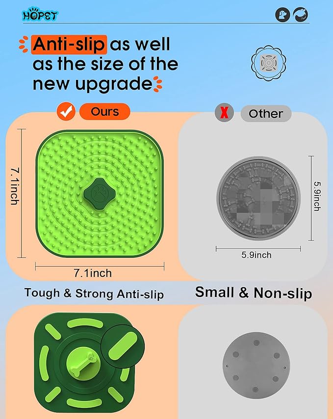 - γππππππ₯ & π π’π₯π π‘π’π‘-π¦πππ£ γ Enjoy a larger & more stable licking mat. Our upgraded version measures 7.24 x 7.48 x 1.54 inches, providing ample space for food. The enhanced anti-slip design features 8 non-slip pads, ensuring stability on flat, smooth floors