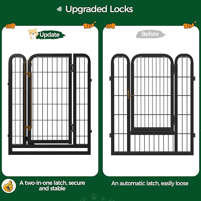 - Safety & Security: Ensuring the safety of your pets is of utmost importance to us. Our exercise pen is crafted with appropriate bar spacing and the latches that lock automatically as you close the door. Rounded edges also protect animals from injuries while preventing damage to wood or PVC floors. Additionally, stakes anchor the panels firmly to the grass or soft ground