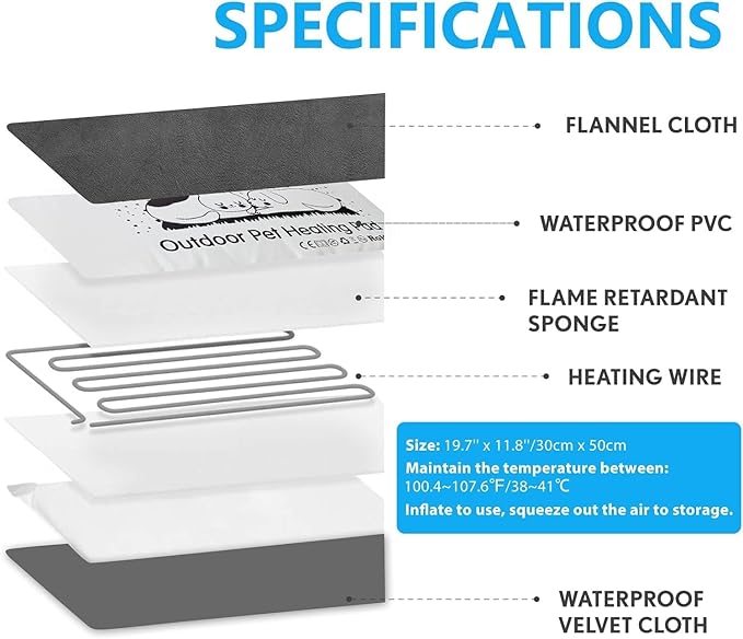 - 🐾WATERPROOF OUTDOOR PET HEATING PAD🐾 This outdoor cat heating pads is IP67 waterproof. Built with the auto thermal system to maintain the temperature between 100.4℉~107.6℉. This heating mat size is 30 x 50cm (19.7'' x 11.8''). It is suitable for most small animals, including cats, dogs, rabbits, ferrets, chinchillas, guinea pigs, etc.
