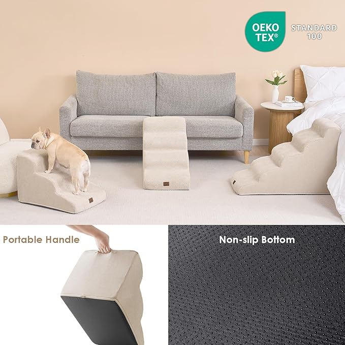 - SPECIFIC AND STEADY DESIGN - 33D density of pure foam make this stair more steady when your pets walk on. The dog bed stairs can provide strong support for pets in the walking process. Low angle slope design can better protect your pet's joints.