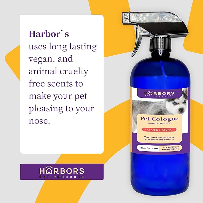 - GROOMER RECOMMENDED. Our pet cologne is recommended by professionals for dogs, cats, puppies, kittens, ferrets, guinea pigs and rabbits of all ages with normal or sensitive skin. A few spritzes will have your beloved fur companion smelling like they just came from the grooming day spa. Harbor’s Baby Powder pet cologne is suited for all types of fur.