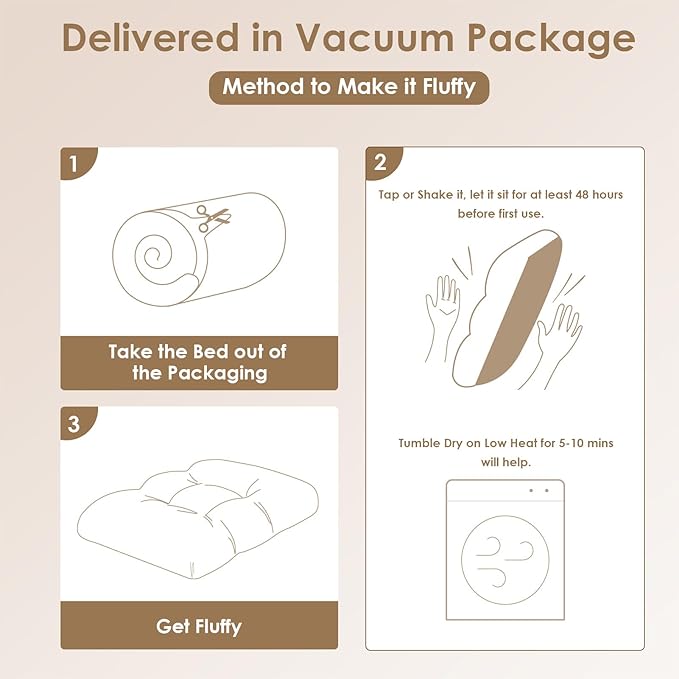 - MACHINE WASH and CARE INSTRUCTION - The washable dog bed can be put directly into the washing machine as a whole. This plush dog bed is vacuum-compressed, please remove the compression bag, shake it completely, and leave it for about 24 hours to expand. After washing and before use, please shake the bed back fluffy.