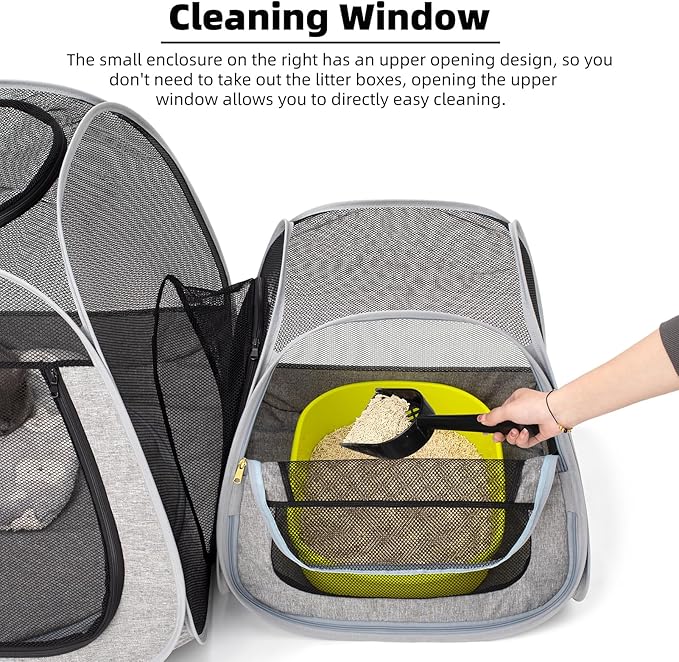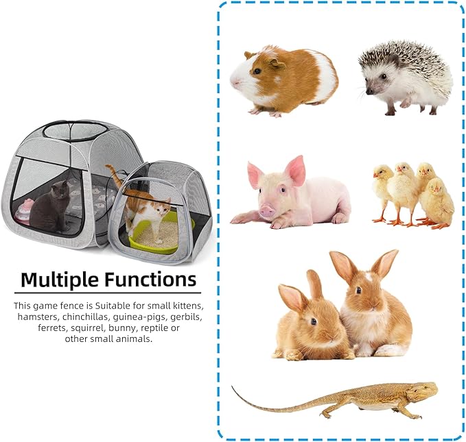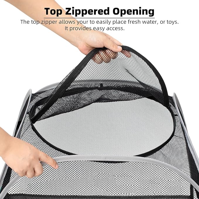 - Top & Bottom Zippered Design: The top zipper allows you to easily place fresh water, or toys. It provides easy access. You was able to keep him safely contained when you wasn’t able to monitor him. Bottom zipper you can remove it for washing, if necessary. It's also nice for outdoor use if you wanted to place the enclosure on your lawn.