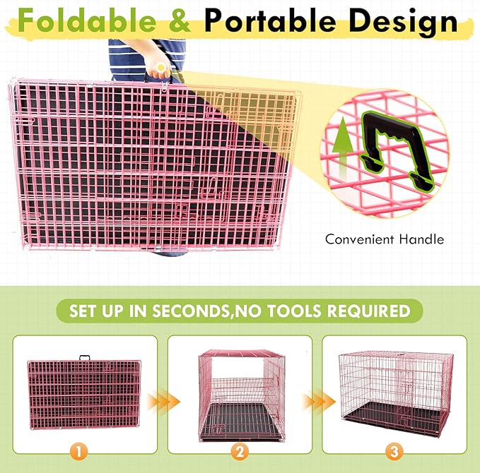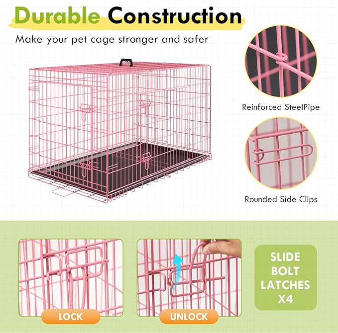 PayLessHere Large Dog Crate Kennel for Medium Large Dogs Metal Dog Cage Double-Door Folding Travel Indoor Outdoor Puppy Playpen with Divider and Handle Plastic Tray (42 Inch, Pink)