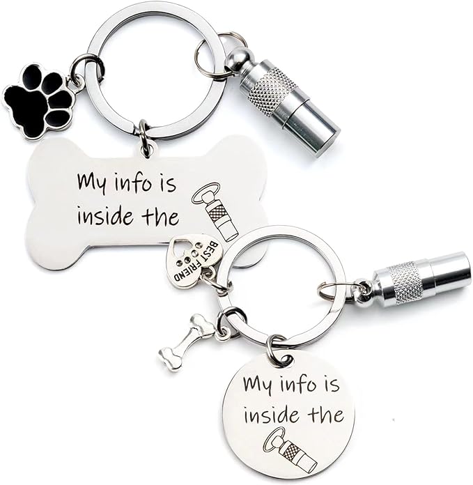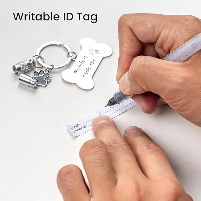 - The dog id tag has address paper inserts where owner contact information can be written and a thank you message for returning the pet to help your pet get home if it goes missing. The pet ID card is protected by a pendant and the contents inside will not wear and fade..