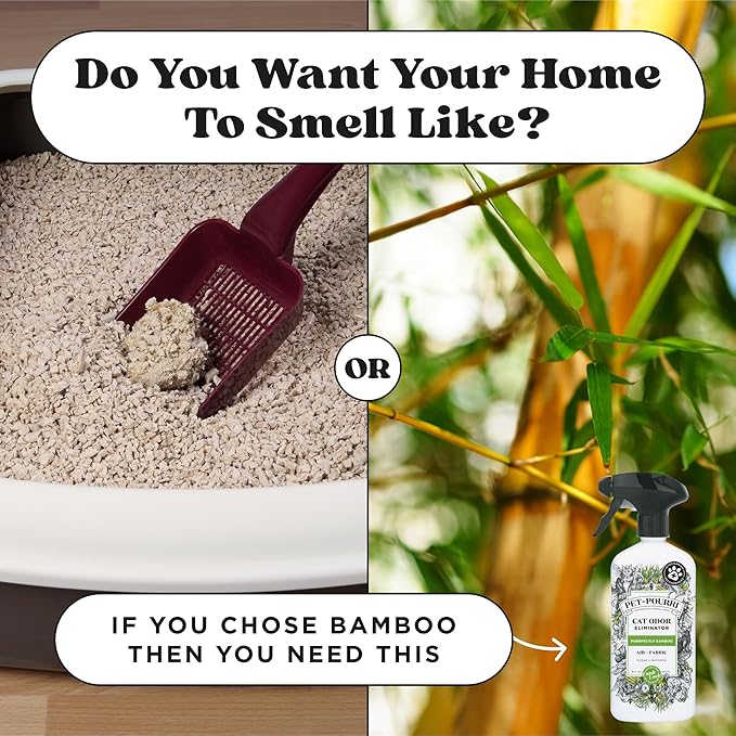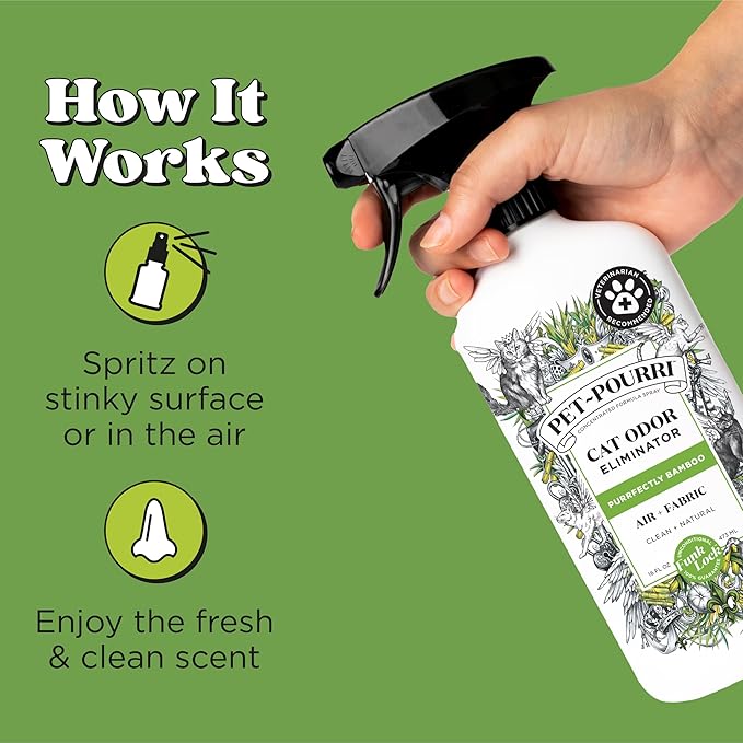 - Naturally Long-Lasting, Light & Fresh: Infused with Bamboo, Jasmine & Pear, this cat freshener spray provides a soft, fresh aroma that won’t overpower sensitive cat (or human) noses, leaving your home smelling fresh & clean.