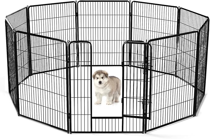 - 【Tailored Options for Every Pet】 Available in 8-panel and 16-panel, with 3 kind of heights: 24”, 32”, and 40”. Our diverse selection ensures a perfect fit for dogs of all sizes and accommodates various pets, such as kitten, cats, rabbits and so on, providing a reliable and comfortable space for all. And it’s easy to assemble this foldable metal dog pen according to the desired area of use.